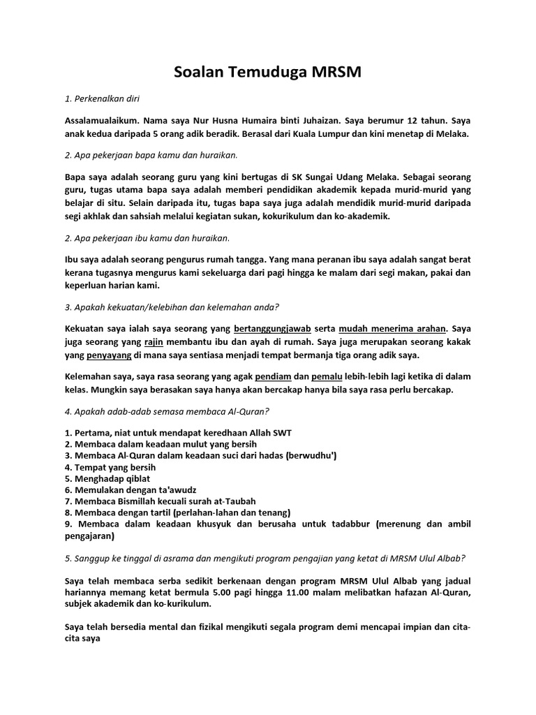 Ulul albab permohonan ini juga terbuka kepada Translate · related posts to contoh soalan temuduga mrsm ulul albab contoh soalan temuduga mrsm ulul albab 2019 05 31t01:17:00 07:00 rating: Semakan ujian kemasukan ke mrsm tingkatan 1. Cara semakan keputusan mrsm tingkatan 1 tahun 2021. Mrsm syarat tambahan osa ujian dan temu duga pilihan mrsm program spmrsm mersing beseri. Dato' seri idris bin jusoh pada 31 mei 1996 dalam menginovasikan sistem pendidikan di malaysia. Ada 2 ujian yang wajib diambil iaitu : Panggilan ujian ukkm dan ujian ulul albab di kawasan zon merah atau zon yang sedang dilaksanakan pkpb/ pkpd adalah ditangguhkan dan tarikh ujian akan diberitahu kelak. Pemohon program ulul albab diwajibkan untuk menduduki ujian hafazan sebagai syarat tambahan. Panduan ukkm ulul albab 2021 (akan dikemaskini) semakan dan pendaftaran Khusus untuk calon yang memohon program ulul albab, anda diwajibkan untuk menduduki ujian hafazan dan tulisan jawi. Kemasukan ke mrsm tingkatan satu. Ujian kemasukkan mrsm (ukkm) dan ujian ulul albab di mrsm alor gajah melaka.